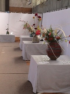 | 花フェスタ会場 地元陶芸家の器を使って 華道家元の流派を超えた競演です。 |